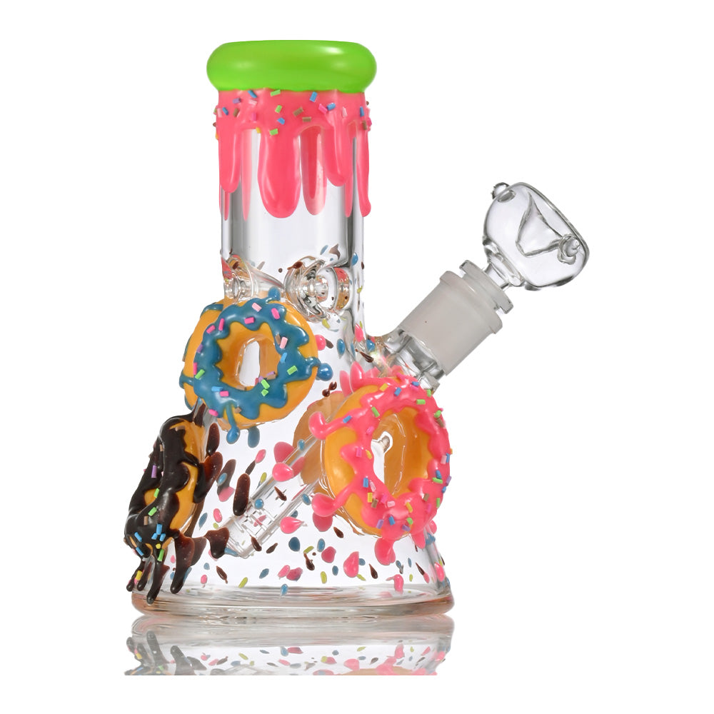 This compact novelty glass piece features a fun, eye-catching donut and drip dessert theme with colorful sprinkle accents. Crafted from clear, durable glass, it includes a stable beaker base, angled joint, and decorative donut attachments for a playful yet functional design. A unique statement piece that combines smooth performance with bold, artistic styling.
