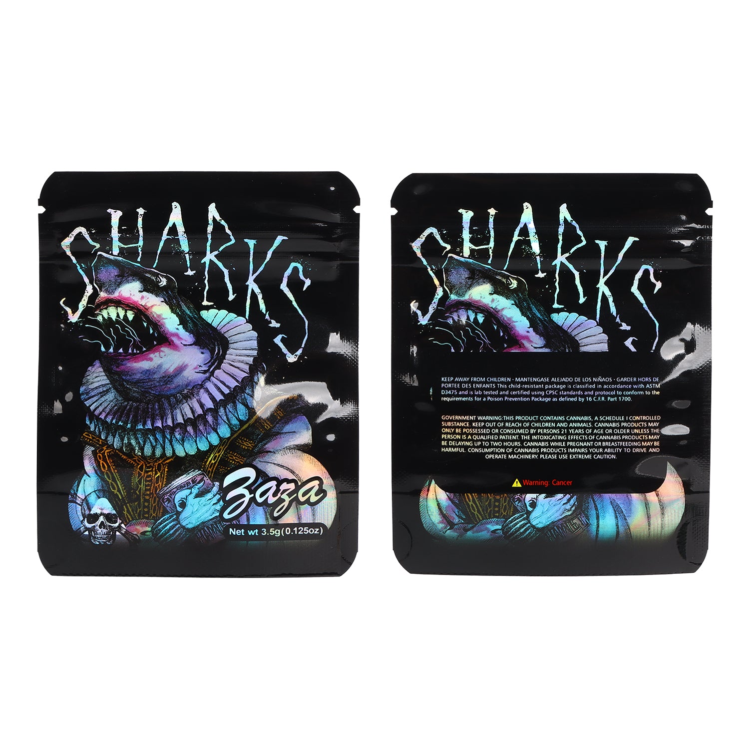Zaza Shark warrior artwork Mylar Bag featuring a fierce, stylized shark in battle gear that brings high-energy marine chaos to your packaging, this bag combines standout design with freshness-locking features.Constructed with premium odor-proof mylar.